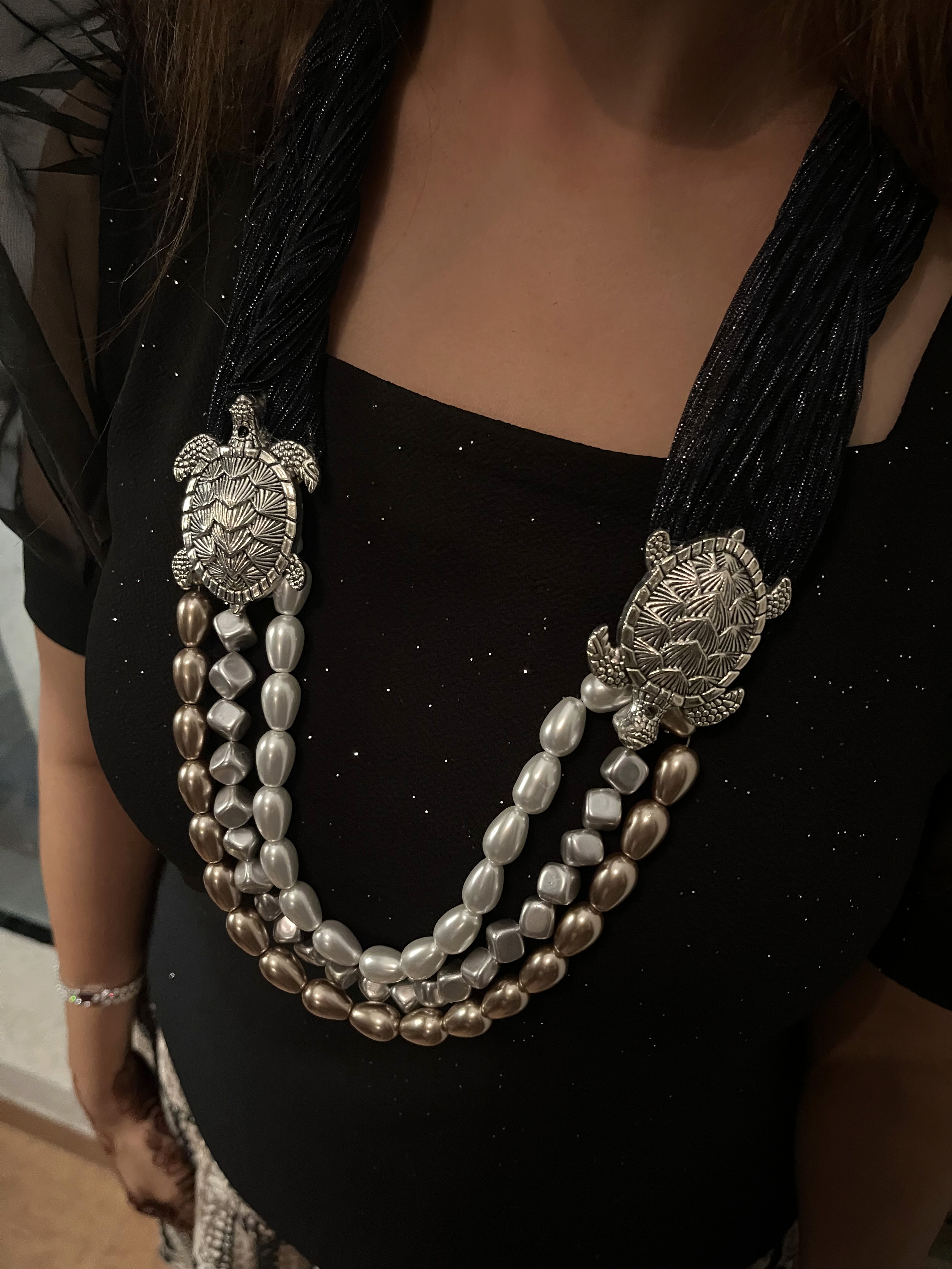 Introducing our signature Rani Haar reimagined, a brand new addition to our collection. This artistic piece features custom silver-tone metal turtle charms, symbolizing wisdom and heritage. This complete new designer and modern take on a rani haar is further detailed with cascading silver and gold-toned pearls. The collar, crafted from luxurious shimmery blue pleated fabric, bears a royal yet talk of the town vibe, and is surrounded by these intricate, dangling pearl strands. Add this royalty to your collection.