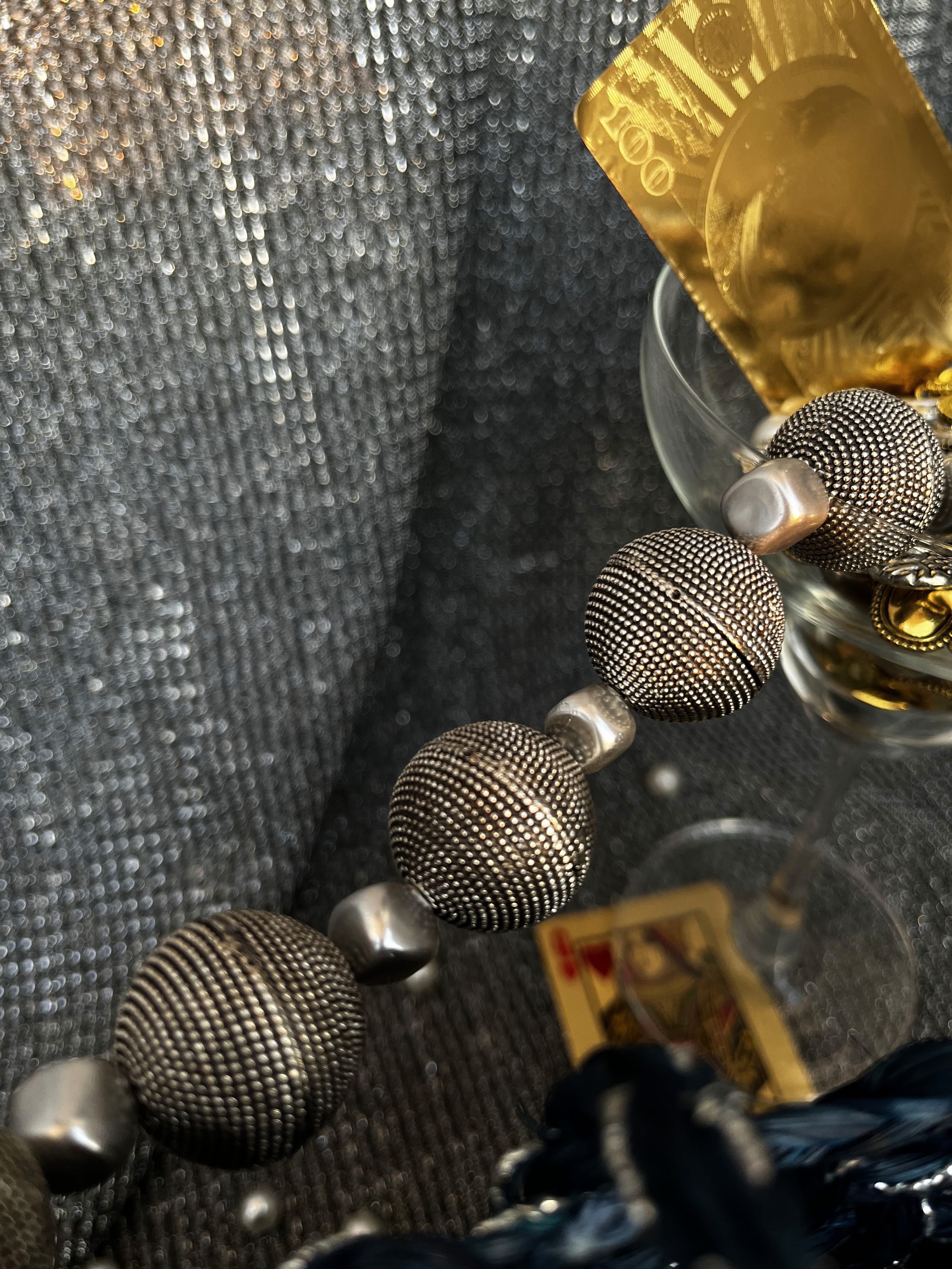 A whimsical journey in our debut collection, this intricately woven handheld party bag features a bold, contemporary silhouette, symbolizing the spirit of adventure and discovery. Hand-embellished on the front and sides with a lively caravan of silver-plated camel charms, each meticulously detailed and marching across the unique woven texture. The bag, crafted from rich, deep blue woven fabric with metallic accents, bears a delicate, handcrafted rosette as its focal point, and is topped with a distinct spherical beaded handle that evokes an effortless, luxurious bohemian spirit