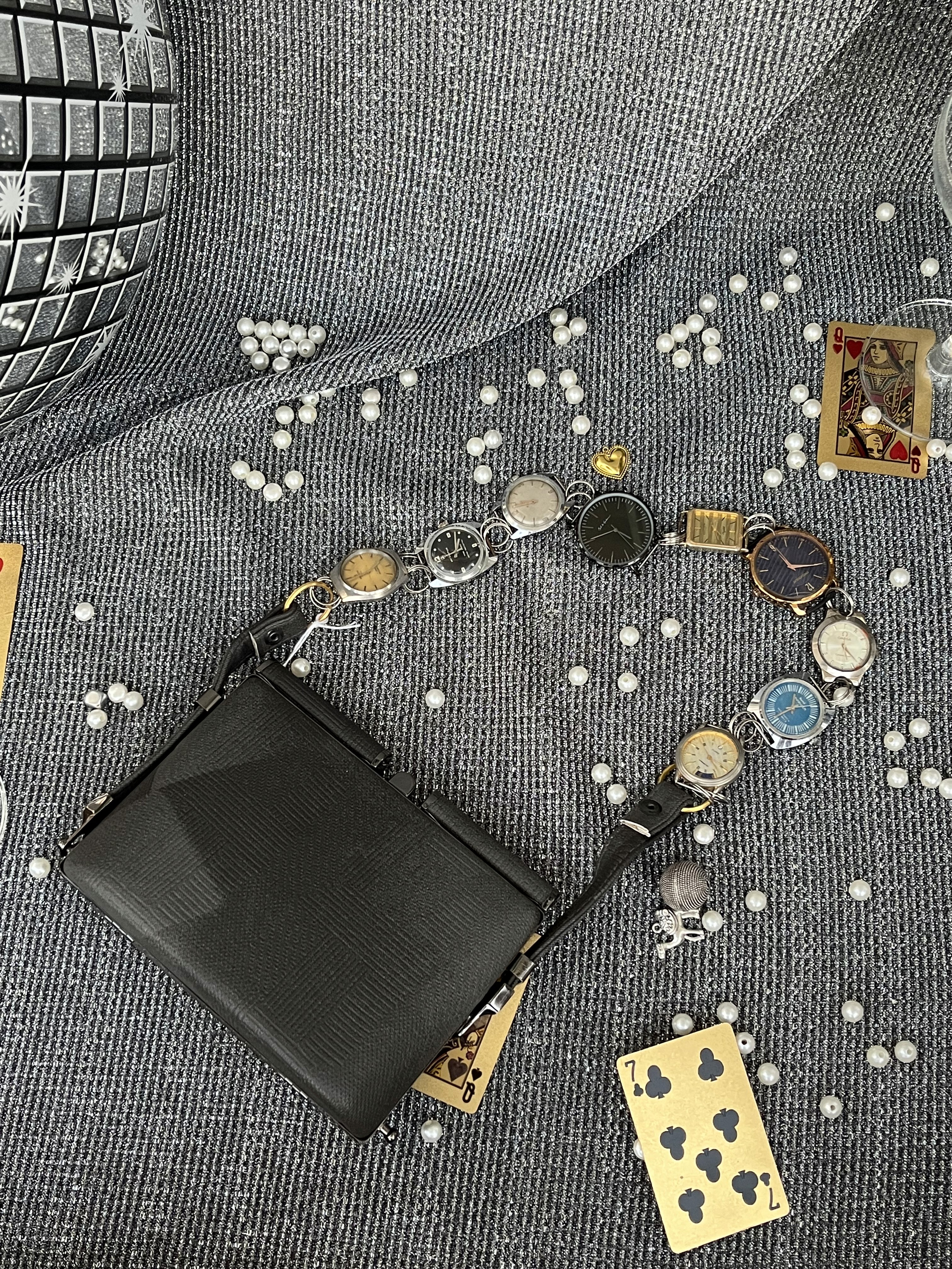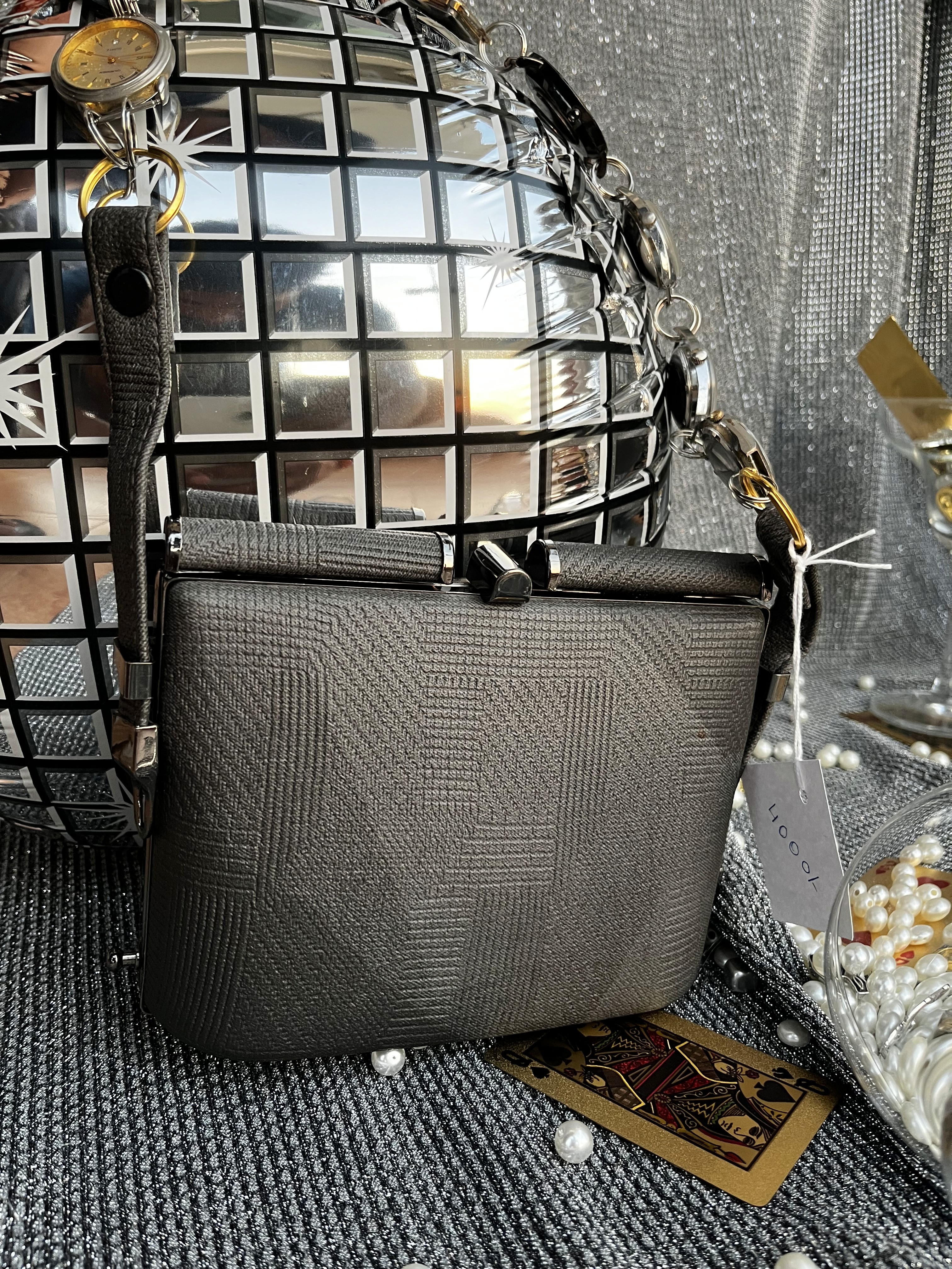 A truly timeless addition to our debut collection, The Dial Bag is a sophisticated shoulder bag that symbolizes the beauty of curated history and enduring style. Its unique strap is meticulously crafted by collecting genuine antique vintage watch dials, each a miniature work of art from a bygone era, creating a captivating link of time. The bag, a sleek black textured clutch, forms a modern counterpoint to the vintage charm, and is anchored by subtle black-toned hardware that evokes an effortless blend of nostalgic elegance and contemporary, high-fashion appeal.