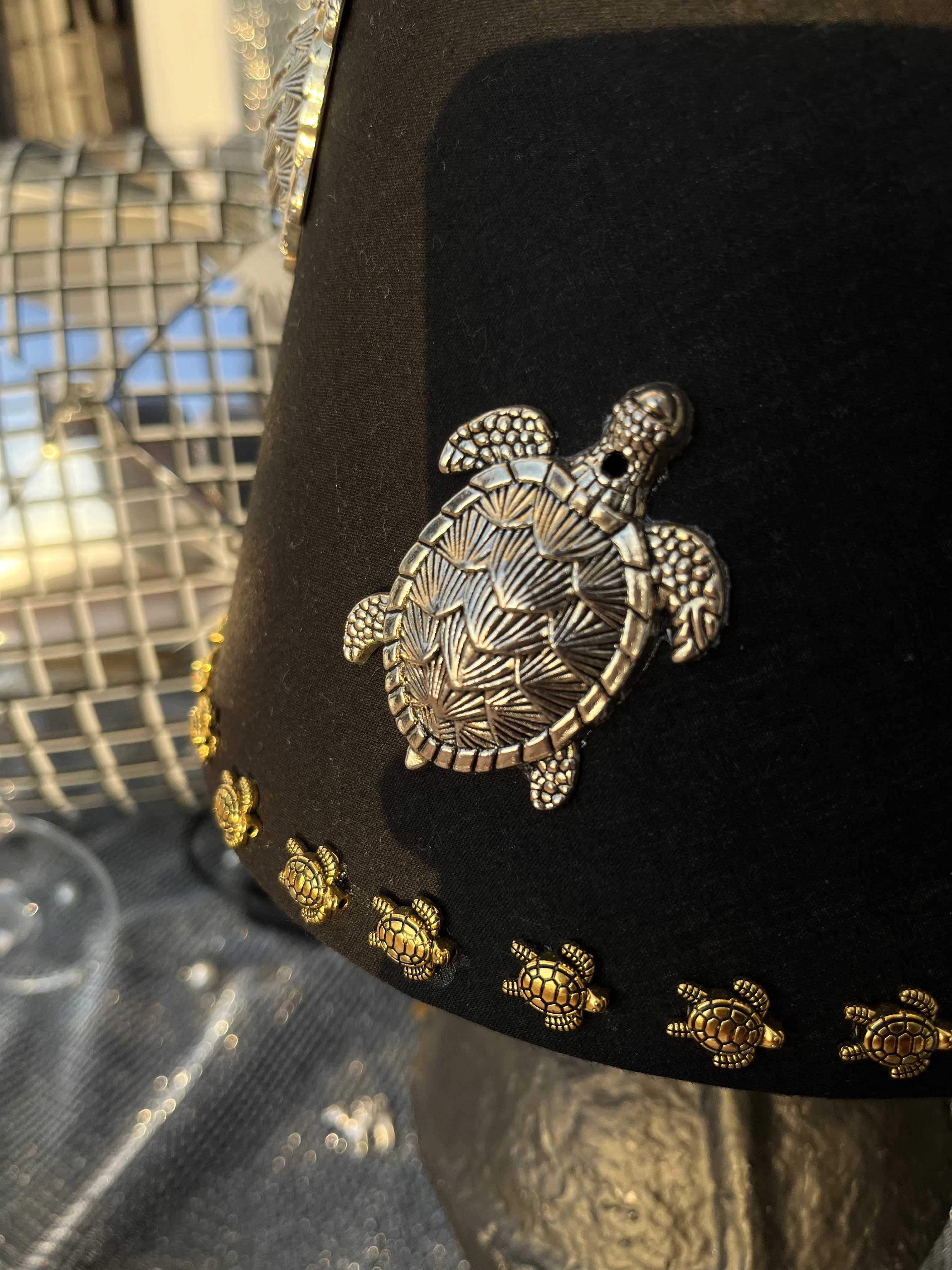 Introducing THE Ebony Turtle Lamp, a brand new addition to our collection. This lamp features custom gold and silver toned metal turtle charms, symbolizing wisdom and a complete positive vastu vibe. Adorned on the shade with these intricate charms, the lamp also features a delicate gold-toned stud trim. The shade, crafted from luxurious black fabric, is paired with a textured, black lightweight base. It is a completely sophisticated artistic piece. Add this royalty to your home.