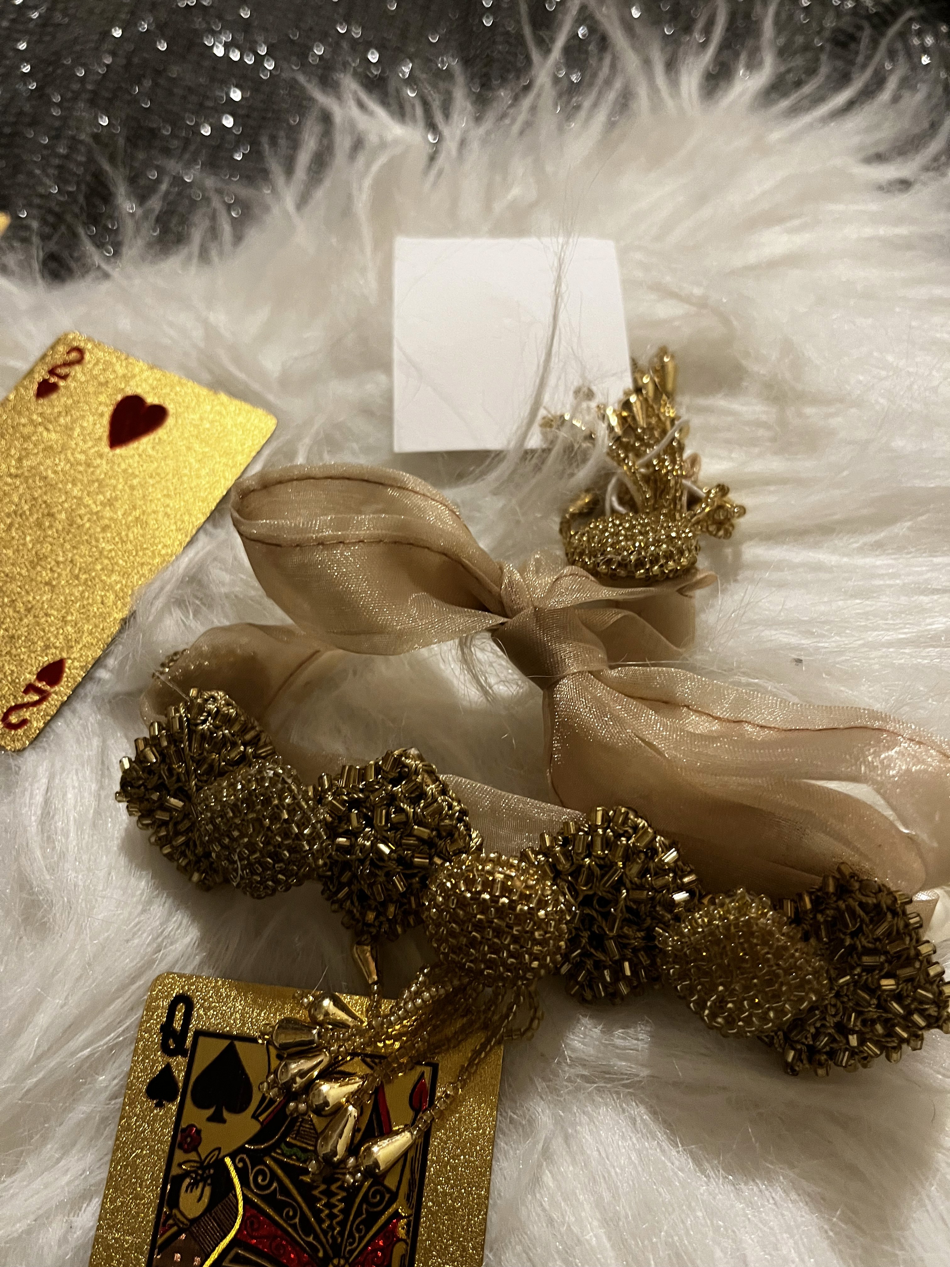 Introducing our signature product, The Gilt Button choker. This statement piece features custom, handcrafted golden beaded buttons, symbolizing bold artistry and true craftmanship. Embellished on the front with these dramatic, three-dimensional clusters that capture the light. The band, crafted from luxurious, soft golden fabric, bears this intricate work of art, creating a perfect fashion runway look.