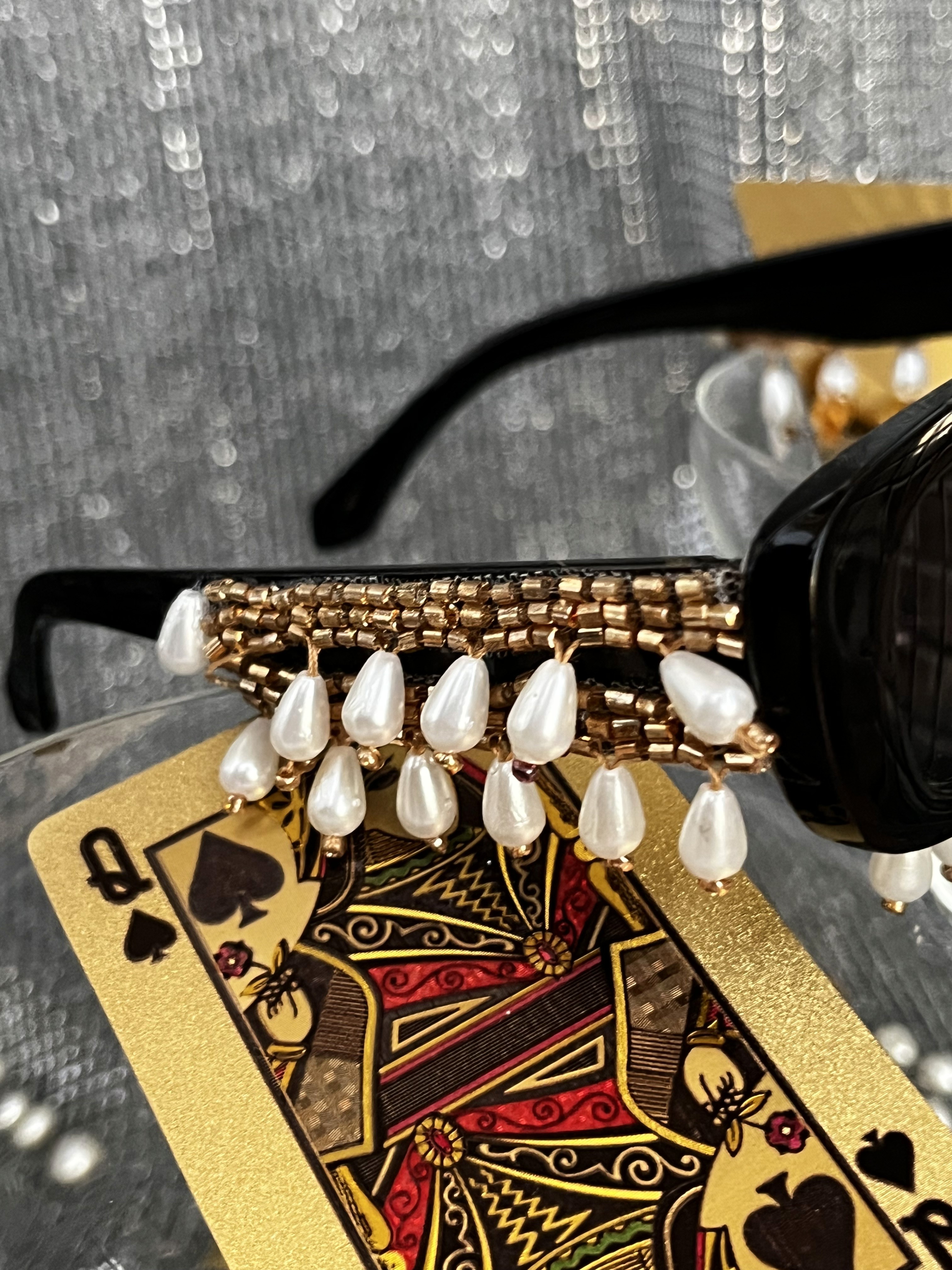 A statement of pure attitude in our debut collection, The Kaleshiii sunglasses are designed for the unapologetic 'Kaleshi Swag Bua,' symbolizing bold confidence and a fearless sense of style. Each pair is 100% handcrafted, transforming classic eyewear into a piece of wearable art, meticulously adorned with lustrous pearls that weep dramatically from the frames. The sleek black frames, a timeless canvas, are accented by subtle gold-toned details, invoking a high-fashion audacity that guarantees you'll be the center of attention.