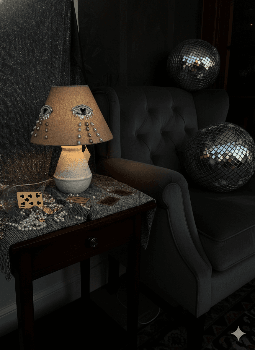 Introducing THE ENCHANTED EYE LAMP, a brand new addition to our collection. This unique lamp features a custom embroidered eye design on its shade, symbolizing mystery and inner vision. Adorned with delicate, embellished teardrop beads that create a 'weeping lamp' effect, it brings a whimsical, story-like touch to your space. The shade, crafted from natural linen, bears an ethereal quality, and is perfectly complemented by its textured, artisanal base. It is a perfect artistic addition to your home.