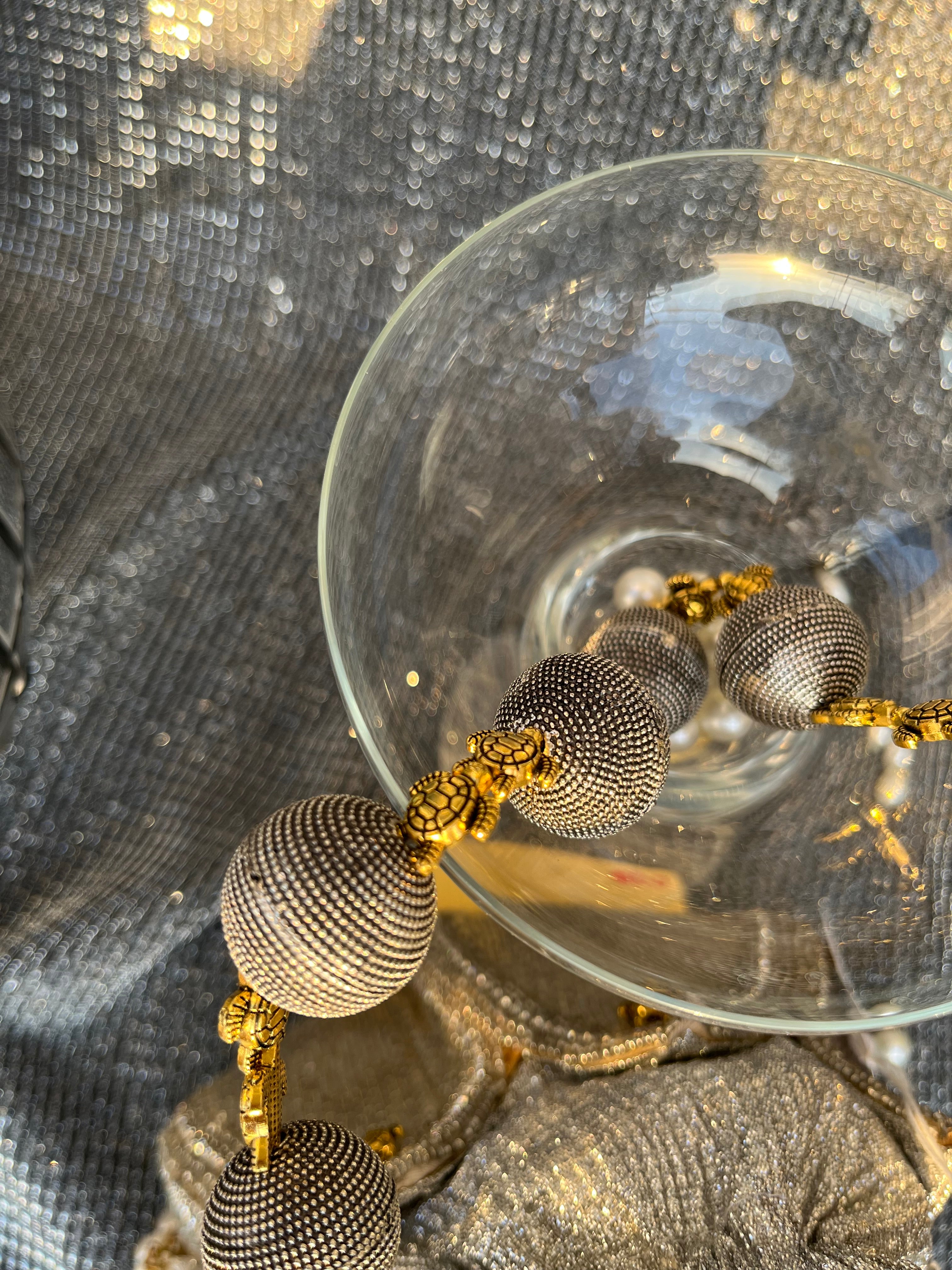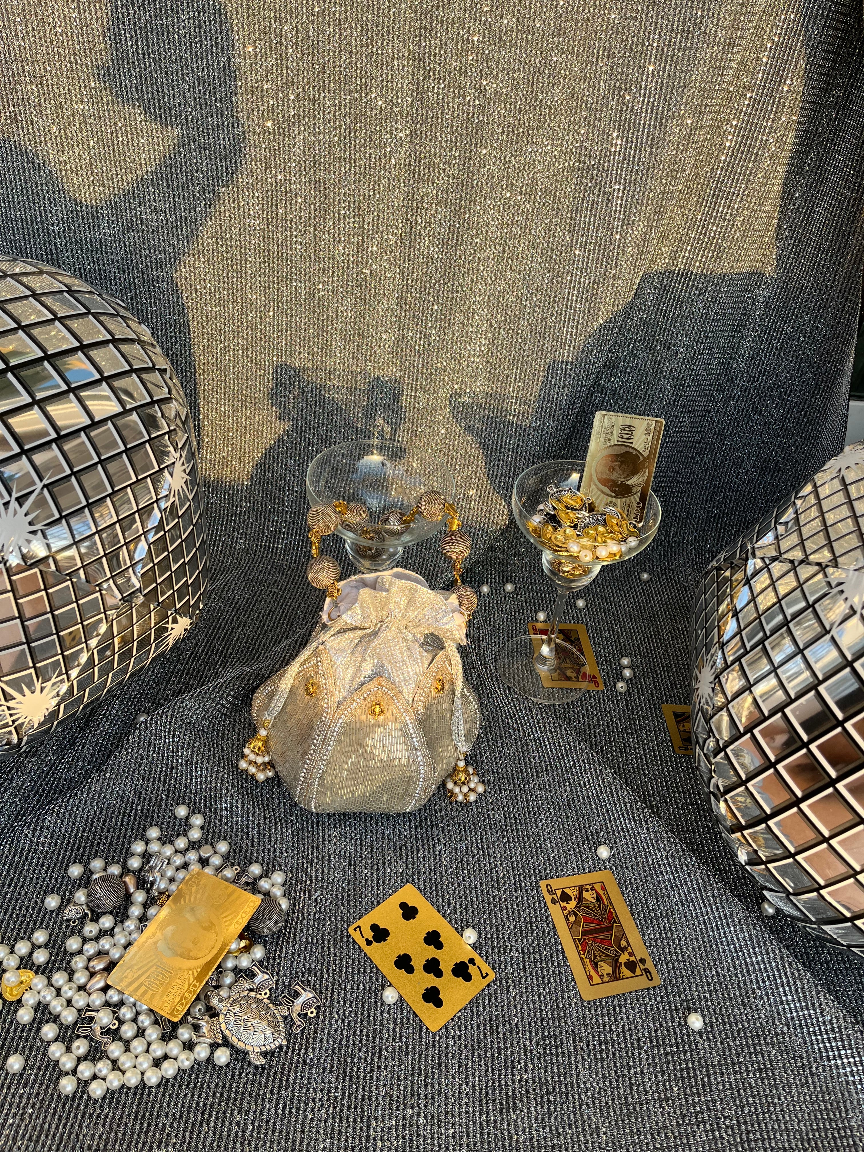 A dazzling interpretation in our debut collection, this Posh Potli reimagines a timeless silhouette, symbolizing modern opulence and festive glamour. This complete hand bead work potli is exquisitely crafted with a meticulous mosaic of shimmering silver-toned beads that form elegant, repeating lotus petal details. The potli, crafted from luxurious metallic fabric, features petal panels further detailed with intricate silver tone work and accented by the unexpected, whimsical touch of our signature gold turtle charms. It is crowned with a striking spherical beaded handle, evoking an effortless blend of heritage artistry and contemporary, high-fashion appeal.