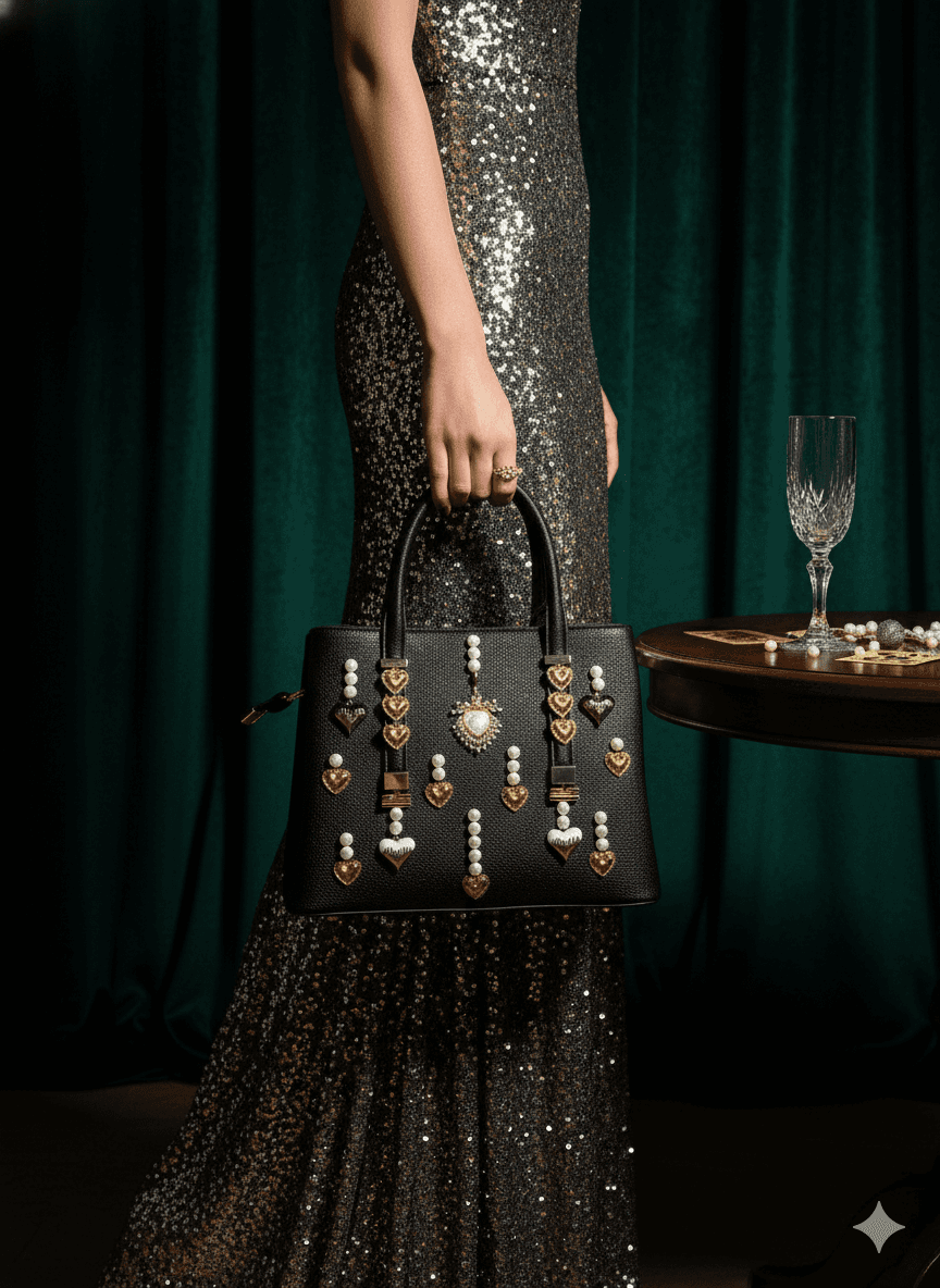 A centerpiece of our debut collection, this structured tote bag features a striking, symmetrical design, symbolizing unapologetic romance and modern luxury. Hand-embellished on the front with our signature 18kt gold-plated heart charms and lustrous pearls, which are arranged in elegant, parallel lines. The bag, crafted from timeless black pebbled leather, bears a magnificent baroque-style pearl heart as its central showpiece—a 18kt gold-plated charm with Mother-of-Pearl (MOP) work, exquisitely studded with Zircon—and is anchored by custom gold hardware that evokes a high-fashion, celebratory spirit. This is a limited-edition collector's piece; only the available stock can be purchased as it will not be made-to-order.
